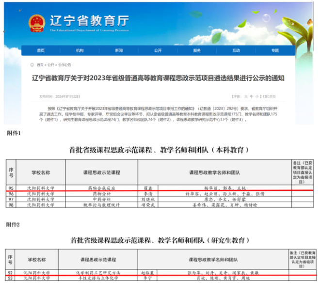近日,辽宁省教育厅公布了2023年省级普通高等教育课程思政示范项目名单,学院翟鑫教授负责的《药物合成反应》课程获批省级普通高等教育本科教育课程思政示范课程、教学名师和教学团队,赵临襄教授负责的《化学制药工艺研究方法》课程获批省级普通高等教育研究生教育课程思政示范课程、教学名师和教学团队。