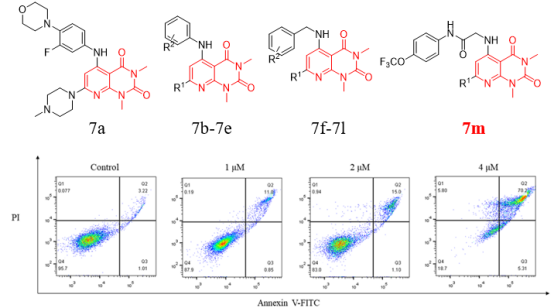 骨肉瘤是一种高度恶性的原发骨肿瘤,主要影响儿童和青少年。Wnt/β-catenin被证明在骨肉瘤中具致癌作用并被过度激活,DKK1蛋白作为该信号通路的分泌型抑制剂,已成为备受期待的抗肿瘤药物研究靶点。课题组前期研究中发现吡啶并[2,3-d]嘧啶类衍生物具有较好的广谱抗肿瘤活性,基于此结构,作者通过骨架跃迁、局部修饰等原理设计并合成了一系列吡啶并[2,3-d]嘧啶-2,4(1H,3H)-二酮类衍生物。经抗骨肉瘤增殖活性筛选,发现化合物7m为最优化合物,其抑制人骨肉瘤细胞143B和MG63的IC50值分别为2.89μM和2.65μM。在RT-qPCR和蛋白质印迹实验中,化合物7m可显著提高DKK1的表达,降低β-catenin的磷酸化水平,从而抑制Wnt/β-catenin信号通路。此外,通过Hoechst染色和流式细胞术,可以观察到化合物7m能够诱导骨肉瘤细胞的凋亡。化合物7m为开发治疗骨肉瘤的DKK1-Wnt/β-catenin抑制剂提供了新思路。