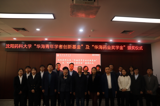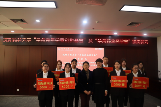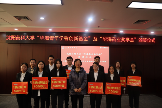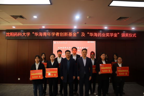 华海药业嘉宾和学校领导为获资助教师和学生颁奖。华海药业人力资源部总监吴野先生为张宇等六名获得“华海青年学者创新基金”的青年教师颁奖。华海药业原料药事业部副总经理朱伟为巩丹丹等五名获得“华海药业奖学金”的博士研究生代表颁奖。球王会体育官方网副院长赵燕芳为王硕等十一名获得“华海药业奖学金”的硕士研究生代表颁奖。华海药业制剂质量研究部高级总监何伟玲、国际销售中心印度业务部总监钟声、国际销售中心人事经理赵仁杰和学校招生就业处副处长董晓辉为王怡等二十名获得“华海药业奖学奖”的本科生代表颁奖。