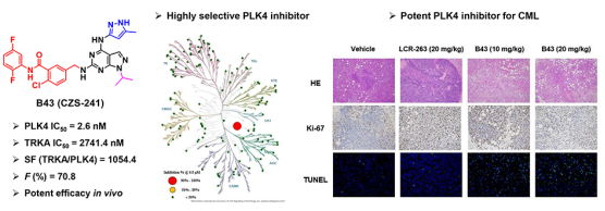 近日,药物化学权威期刊《Journal of Medicinal Chemistry》(IF = 8.039)发表了球王会体育官方网赵冬梅教授/程卯生教授课题组在PLK4抑制剂领域的最新研究成果,文章题目为“Discovery of CZS-241: A Potent, Selective, and Orally Available Polo-Like Kinase 4 Inhibitor for the Treatment of Chronic Myeloid Leukemia”。
