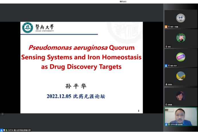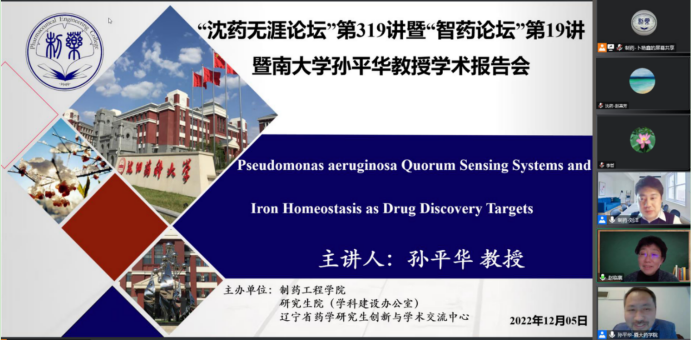 2022年12月5日下午,球王会体育官方网、研究生院、辽宁省药学研究生创新与学术交流中心联合举办了“沈药无涯论坛”第319讲暨“智药论坛”第19讲,暨南大学孙平华教授作了题为“Pseudomonas aeruginosa Quorum Sensing Systems and IronHomeostasis as Drug Discovery Targets”的报告。会议由制药工程学科副主席刘洋教授主持,学院领导班子成员、全院研究生导师和研究生共300余人参会。