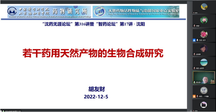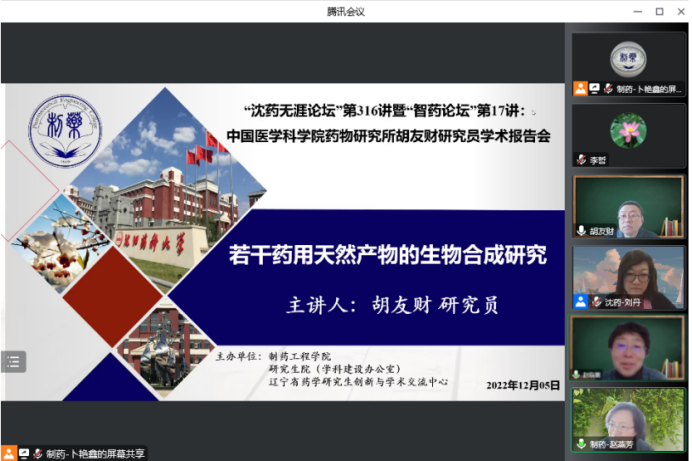 2022年12月5日上午,球王会体育官方网、研究生院、辽宁省药学研究生创新与学术交流中心联合举办了“沈药无涯论坛”第316讲暨“智药论坛”第17讲,中国医学科学院药物研究所胡友财研究员作了题为“若干药用天然产物的生物合成研究”的报告。会议由球王会体育官方网药物化学系主任刘丹教授主持,学院领导班子成员、研究生导师和研究生近300人参会。