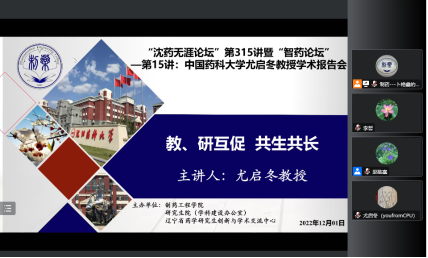 2022年12月1日上午,球王会体育官方网、研究生院、辽宁省药学研究生创新与学术交流中心联合举办了“沈药无涯论坛”第315讲暨“智药论坛”第15讲,中国药科大学尤启冬教授作了题为“教、研互促 共生共长”的报告。会议由球王会体育官方网院长赵临襄教授主持,学院领导班子成员、全院研究生导师和研究生共300余人参会。
