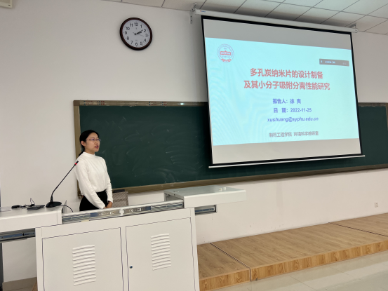 随后,徐爽博士做了题为“多孔炭纳米片的设计制备及其小分子吸附分离性能研究”报告,结合自己博士期间的研究课题,以气体吸附分离应用为例,详细介绍了混合物气源种类、常见分离技术、多孔固体吸附剂的选择与评价标准、气体吸附分离机制以及该研究领域存在的问题和挑战。