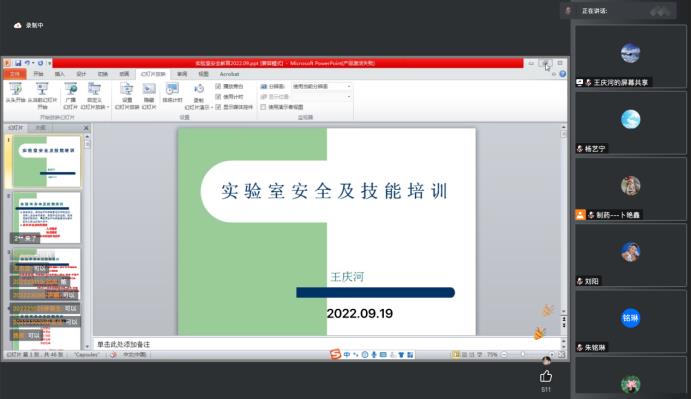 为强化研究生实验安全意识,提高个人防护能力,杜绝实验室安全事故的发生,9月19日,球王会体育官方网通过线上会议的方式举行了“学习安全知识,筑牢安全长城”研究生实验安全教育讲座,特别邀请学院化学实验中心副主任王庆河担任主讲人。学院党委书记李哲、党委副书记刘阳、研究生辅导员杨艺宁、朱铭琳及全体研究生参加了本次讲座,讲座由学院研究生辅导员卜艳鑫主持。
