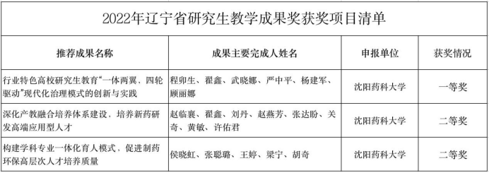 近日,辽宁省教育厅发布了2022年辽宁省研究生教育教学成果奖获奖名单。球王会体育官方网由程卯生教授等组织申报的《行业特色高校研究生教育“一体两翼,四轮驱动”现代化治理模式的创新与实践》荣获一等奖;由赵临襄教授等组织申报的《深化产教融合培养体系建设,培养新药研发高端应用型人才》、由侯晓虹教授等组织申报的《构建学科专业一体化育人模式,促进制药环保高层次人才培养质量》荣获二等奖。