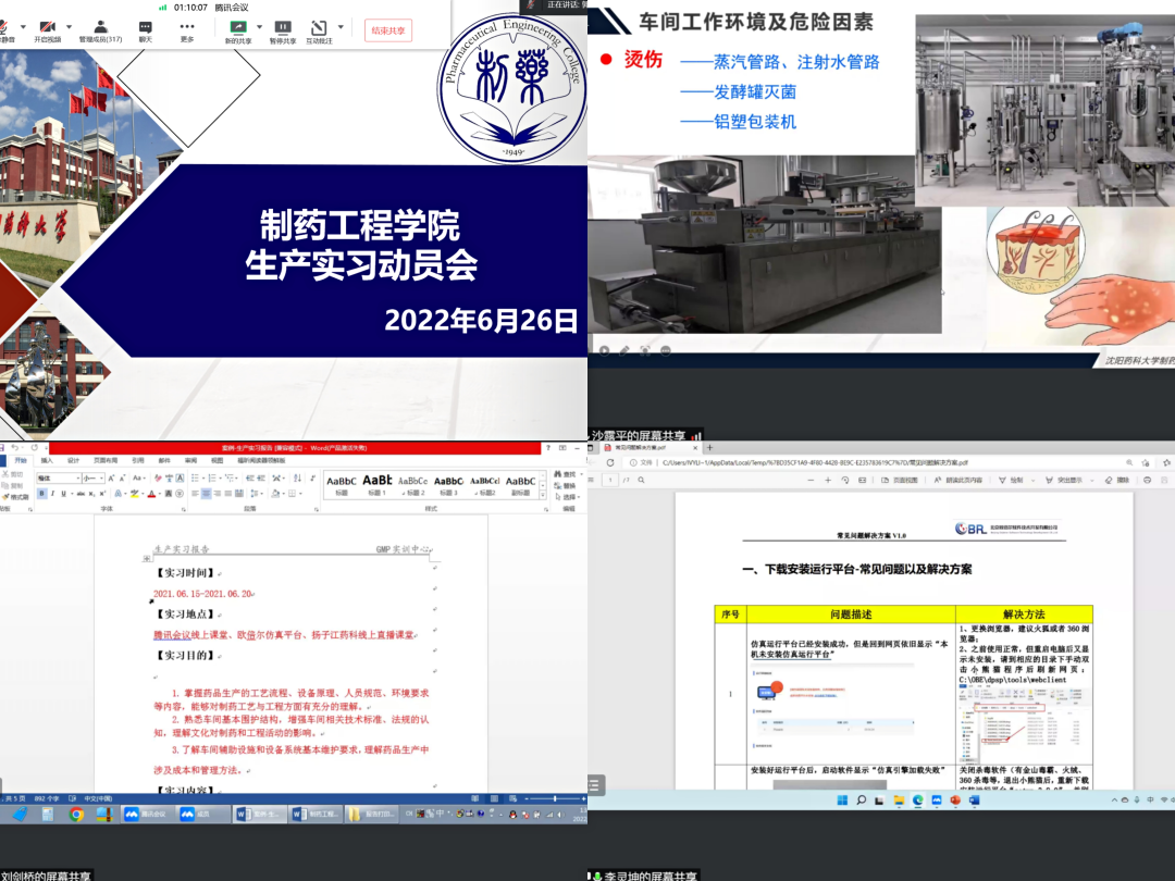 在生产实习开始前,副院长郭永学组织召开了生产实习总动员,介绍了本次生产实习的安排,分为专家线上讲座、教师线上讲解、虚拟仿真实验、扬子江药业集团线上直播学习四部分,强调了生产实习对整合知识,提升技能的重要意义。动员会上,药品GMP实训中心的沙露平老师讲解了实际生产过程中应注意的安全问题,刘剑桥老师讲解了实习报告撰写的注意事项,李灵坤老师针对欧贝尔虚拟仿真软件的使用为同学们做了培训。