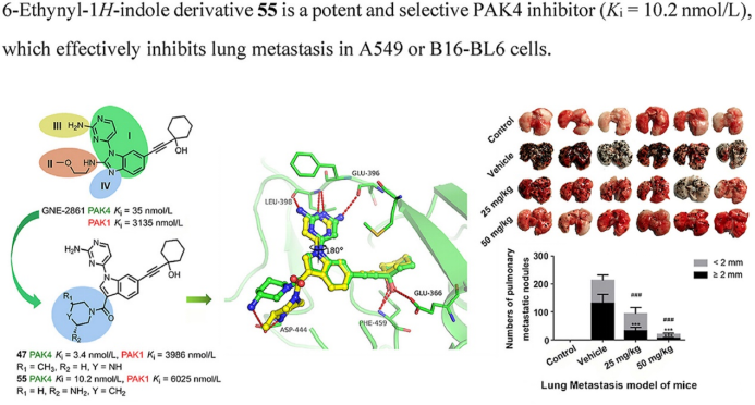 球王会体育官方网程卯生教授团队在X射线结晶学和结构优化的指导下,通过对先导化合物进行多轮结构优化,得到了一系列3-取代-6-取代乙炔基-1H-吲哚类化合物。作为II类PAKs抑制剂,该系列化合物对PAK4蛋白激酶具有显著的抑制活性和特异性。其中,化合物55对肺癌细胞株A549和黑色素瘤细胞株B16在2.5μM浓度下的迁移抑制率大于40%和60%,优于阳性对照GNE-2861,表现出优异的抗迁移和抗侵袭性能;体内药动实验表明,化合物55在小鼠体内具有适中的半衰期与代谢速率;在裸鼠A549和B16-BL6移植瘤肺转移模型中,化合物55对肺表面转移结节的抑制率分别超过80%和90%。机制研究表明,化合物55减轻转化生长因子-β1诱导的上皮-间充质转化,能够有效抑制肿瘤的迁移、侵袭及转移行为。