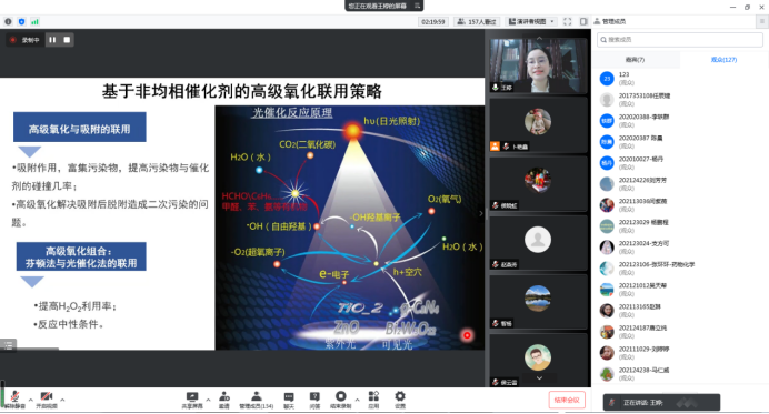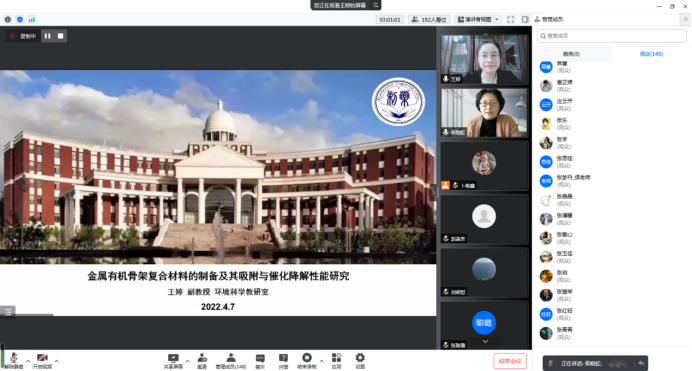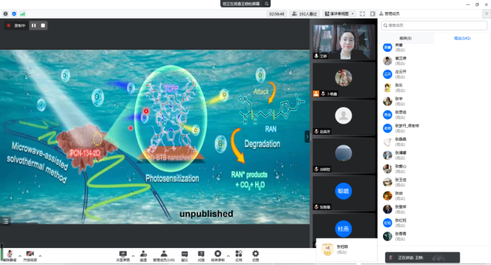 学术报告会上,王婷副教授结合自身的科研经历,以“金属有机骨架复合材料的制备及其吸附与催化降解性能研究”为题,介绍了MOFs及其复合材料作为非均相催化剂在吸附和降解水环境中污染物方面的应用,以及采用大孔-微孔MOFs材料实现了对贵金属纳米粒子的高容量吸附,体现了绿色可持续发展理念;还对MOFs及其复合材料的吸附降解机理做了深入阐释。