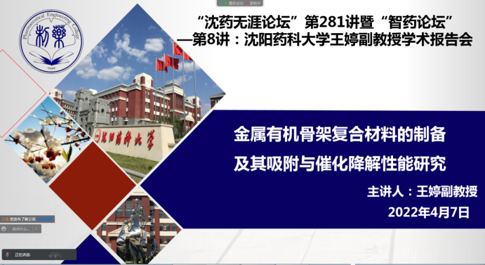 4月7日,由球王会体育官方网、研究生院、辽宁省药学研究生创新与学术交流中心联合举办的“沈药无涯论坛”第281讲暨“智药论坛”第8讲——球王会体育官方网王婷副教授学术报告会在线上热烈展开。会议由球王会体育官方网制药工程与环境科学系主任侯晓虹教授主持,200余人参加了此次学术报告会议。