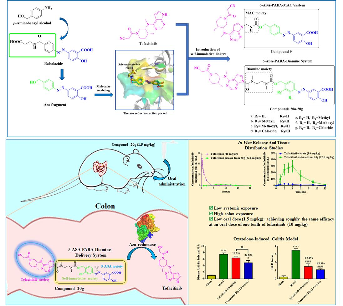 溃疡性结肠炎是一种以直肠、大肠黏膜层炎症和溃疡为特征的慢性炎症性疾病,会严重影响生活质量,同时也是诱发结、直肠癌的高危因素。鉴于JAKs/STAT通路通常与多种炎症细胞因子反应相关,JAKs已成为预防与溃疡性结肠炎相关的过度炎症反应的有效治疗靶点。2018年,JAKs抑制剂托法替尼被批准用于治疗溃疡性结肠炎,其治疗效果显著。然而,它的剂量限制性的全身性不良反应,如血红蛋白减少、中性粒细胞计数减少、总胆固醇升高和感染等,限制了托法替尼的广泛应用。因此,有必要开发新的方法来缓解托法替尼严重的全身不良反应。