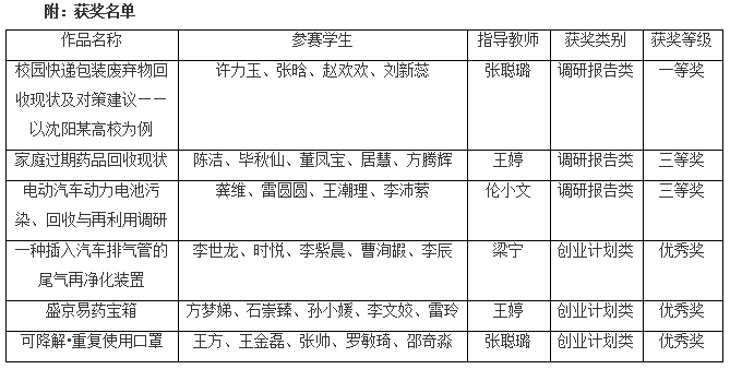 本次大赛旨在提高大学生综合素质和创新实践能力,向大学生传递可持续发展和生态环保理念,激发大学生的创新意识、环保意识和社会责任感,贯彻十九大精神,明确生态兴则文明兴的新目标,推动绿色发展,共同实现和谐生态,绿色发展的梦想,促进人与自然和谐共生,持续推进生态文明建设。环境科学教研室自接到大赛通知以来。积极动员、全面备赛。学生踊跃报名,教师悉心指导,共设计完成6组作品报送大赛组委会。最终,参赛作品《校园快递包装废弃物回收现状及对策建议以沈阳某高校为例》荣获一等奖,《家庭过期药品回收现状》、《电动汽车动力电池污染、回收与再利用调研》荣获三等奖。