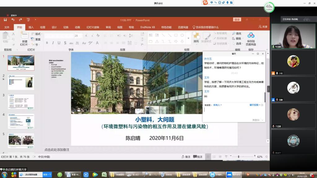 在线上分享中,陈启晴校友首先简明扼要地汇报了个人的求学经历和科研成长之路。然后深入浅出、详尽地介绍了水环境中微塑料、纳米材料及其复合污染的生物效应研究,通过识别水环境中塑料残骸上的有机污染负载特征,建立了微塑料“载体”作用的潜在风险评估和预测方法。陈启晴校友关于微塑料的研究成果填补了我国在塑料负载有机污染物的复合污染特征方面的空白,为塑料废弃物的管理和塑料污染治理提供了坚实的科学依据,奠定了坚实的理论基础。陈启晴校友以个人的成长经历为在校的学弟学妹们、尤其是考研同学树立了科研之路的典范,更坚定了他们走科研道路的决心和信心。陈启晴校友精彩的科研分享在与会学生中引起强烈反响。参会的同学们分别就关心的微塑料降解、PPCP毒理研究现状、同济大学环境类研究方向、学业规划等问题与陈启晴学姐展开了亲切愉快的交流。同时,陈启晴校友表达了对环境科学专业教师的深深感谢,正是老师们一直以来的专业自信才促使她毕业后坚决选择环境科学专业读研;正是环境科学专业特色鲜明人才培养模式,才使得她在后来的科研路上思路开阔。陈启晴校友的精彩分享,对环境专业学生的学业和科研成长规划具有重要指导意义,大大提升了学生本专业深造的信心。最后,环境科学教研室教师就校际合作、聘请兼职导师、科研交流合作等方面进行了深入探讨,并达成初步共识。