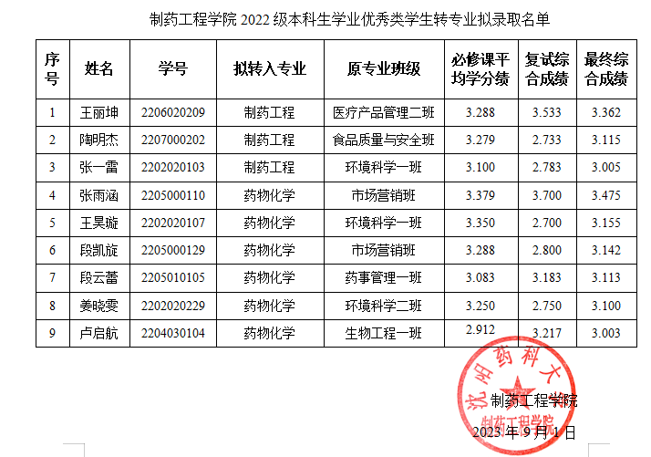 根据《球王会体育官方网本科学生学籍管理规定》(沈药大教务字〔2019〕59号)、《球王会体育官方网本科生转专业实施办法(试行)》(沈药大教务字〔2018〕34号)的有关规定。经学生自愿报名、转出学院审核、转入学院复试考核等工作程序,现将球王会官网2022级本科生学业优秀类学生转专业拟录取名单公示,公示期三天,截止到2023年9月3日16:00。