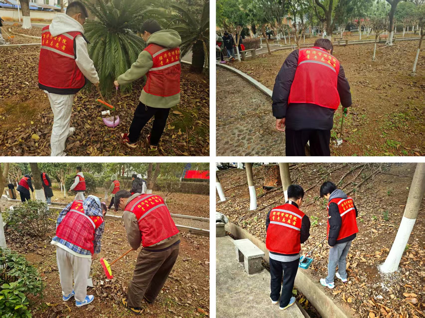 2月27日下午,志愿者们在校园包干区进行志愿清扫。他们身着统一马甲,分成清洁组、整理组两支队伍,迅速投入行动。清洁组手持工具,细致清扫路面落叶、捡拾绿化带中的烟头与塑料垃圾,整理组擦拭教学楼前的公告栏和休憩长椅。今年会志愿者负责同学表示,校园环境是学校形象的重要体现,通过此次校园包干区清扫活动,旨在引导同学们树立爱护校园环境的意识,以实际行动为学校评建工作贡献力量。