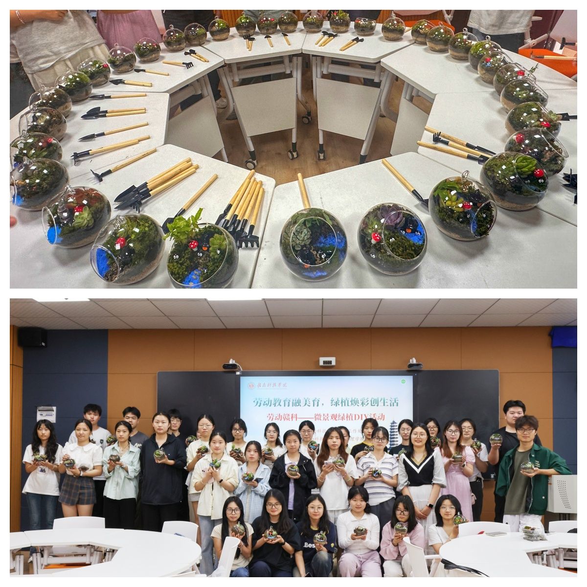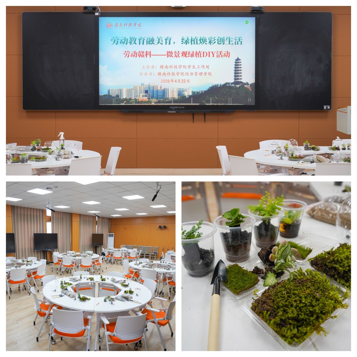 本网讯:为践行“五育并举”教育理念,促进学生全面发展,4月22日下午,我校于崇善楼Z629教室开展“劳动赣科”大学生实践成长计划之植物微景观制作活动。学校40余名师生参与此次活动。