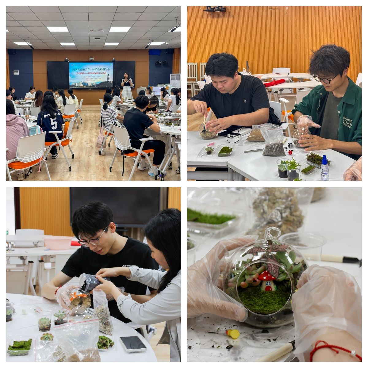 制作过程中,学生们分成小组,积极动手实践。同学们化身“自然设计师”,将绿意盎然的苔藓、形态各异的多肉与精巧的装饰品巧妙搭配,精心打造出属于自己的微观世界。一方方玻璃容器中,绿意蔓延、春色跃动,既有自然的清新,又融入了独特的艺术气息。大家相互交流创作思路,分享栽培心得,现场气氛轻松愉悦。会计231班方可嘉同学表示:“通过此次活动,我真正感受到了微景观以方寸之地浓缩出的自然意趣。我不仅需要细致地模拟出植物生长的环境,还需要构思独具特色的布局与搭配,让我解锁新技能的同时,身心也得到了充分放松!”