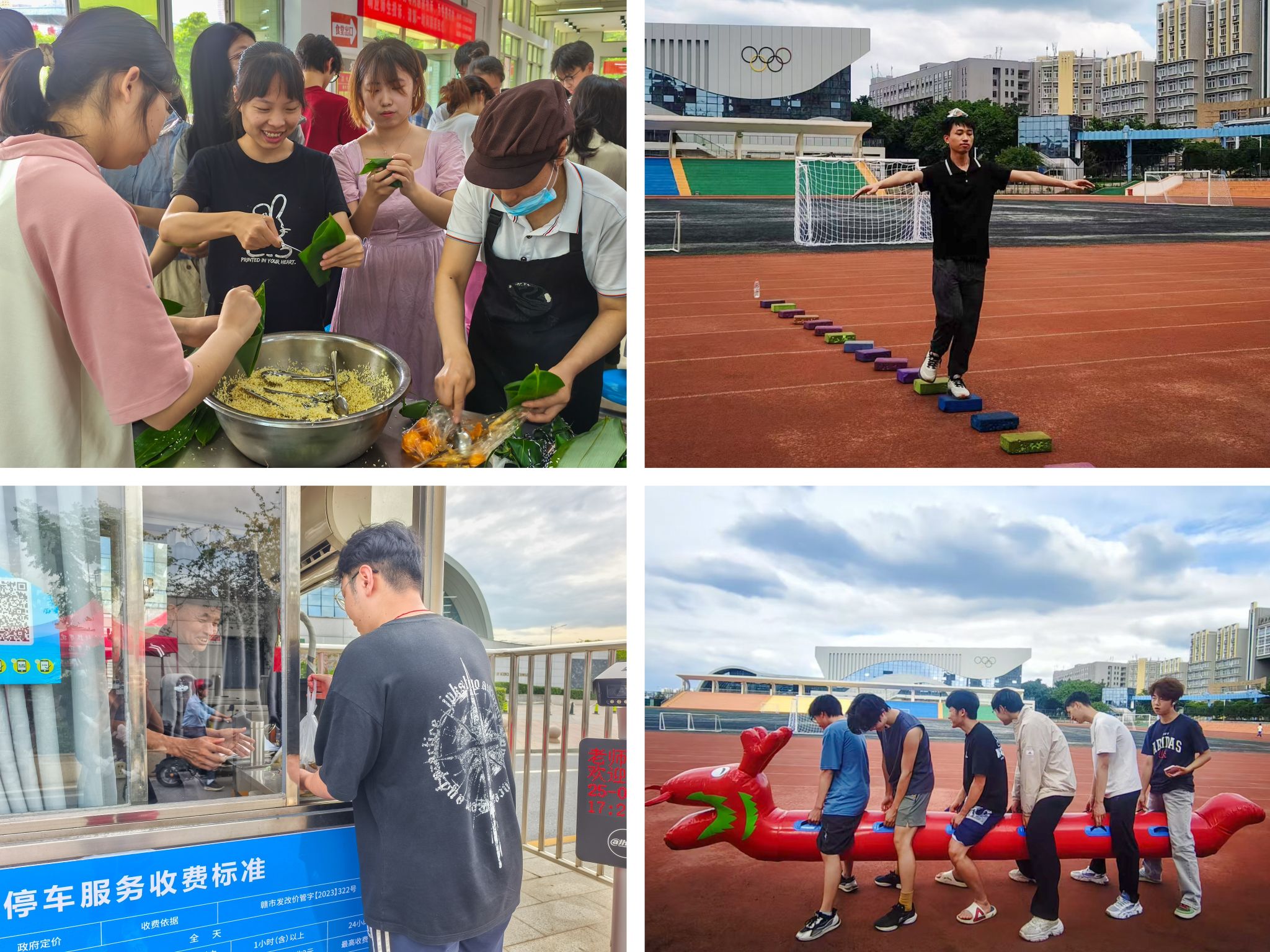 活动现场,食堂一楼馨芳园工作人员帮助学生处理食材,示范包粽技艺,粽叶折叠间,糯米与馅料在娴熟手法中化作精巧粽身。学生们分组动手实践,虽手法青涩却热情洋溢,但始终怀揣着对民俗文化的热忱,在相互交流中探寻传统工艺的奥秘。制作结束后,学生们携带亲手包制的粽子,向坚守工作岗位的保安叔叔、保洁阿姨等送上节日问候。此次活动还设置多元趣味环节:诗词问答与套圈游戏相映成趣,参与者在文化互动中深化对端午的认知;操场上,旱地龙舟赛的协作呐喊与粽子运送挑战的竞技热情此起彼伏,将节日氛围推向高潮,粽叶清香与欢声笑语共同勾勒出一幅温馨美好的校园端午图景。