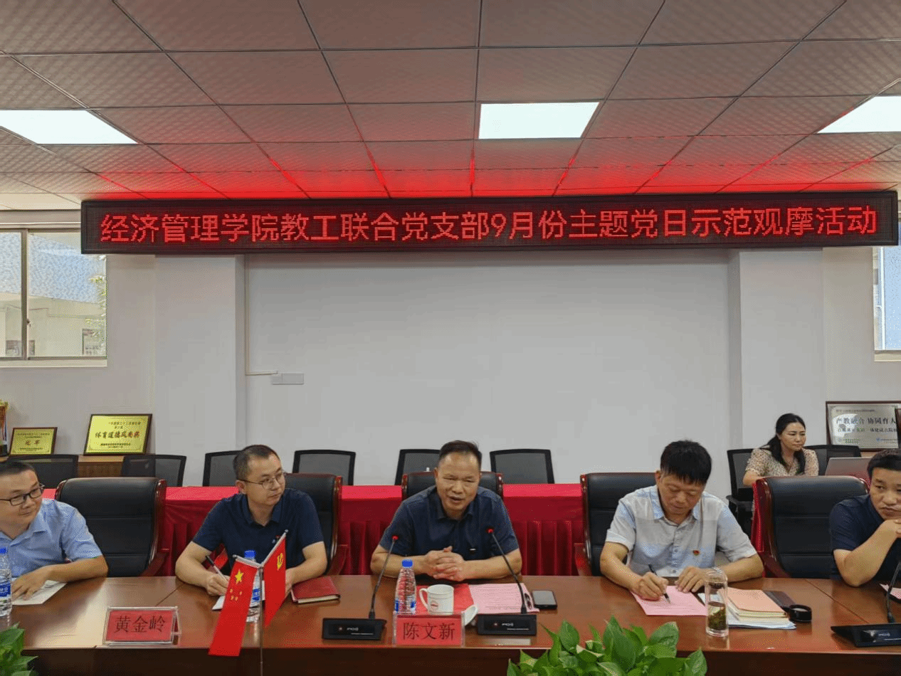 本网讯:为深入学习贯彻习近平总书记重要讲话精神,大力弘扬教育家精神,强化教师队伍建设,9月28日上午,经管学院教工第一、第二党支部在学院305会议室联合开展了“以教育家精神强师铸魂,谱写教育强国建设华章”为主题的主题党日示范观摩活动。赣南科技学院党委委员、纪委书记陈文新出席活动,学校相关职能部门及各二级学院观摩同志,今年会教工第一、第二党支部全体党员共同参与,活动由学院教工第一党支部书记黄金岭主持。