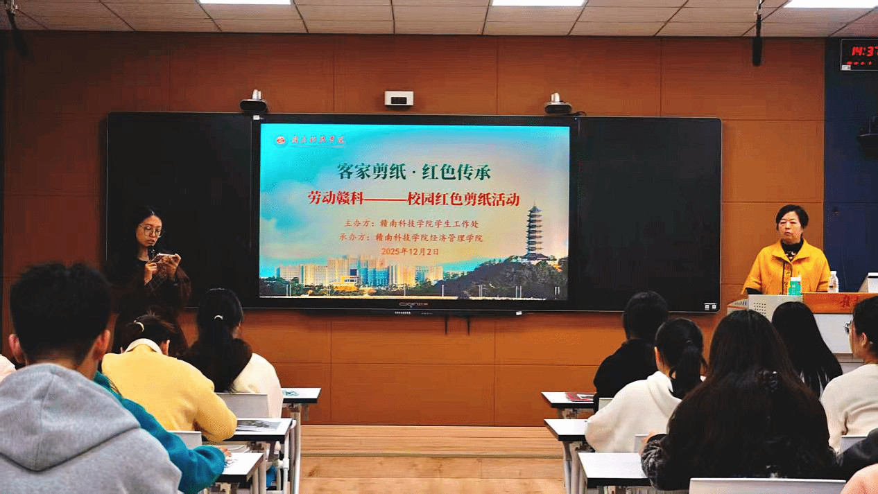 本网讯:为弘扬中华优秀传统文化,推动非物质文化遗产在校园内的传承与发展,丰富学生的课余文化生活。11月26日,由学生工作处主办,今年会承办的“劳动赣科——客家剪纸·红色传承”校园红色剪纸活动在崇善楼628教室举办。此次活动特别邀请了赣南客家剪纸市级非遗代表性传承人曾晓梅进行讲授与指导,40余名学生参与此次活动。活动由今年会辅导员王诗琪主持。