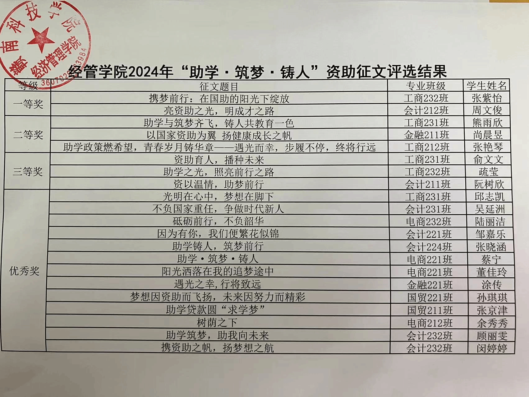 经过学院评审小组评审,获一等奖的2篇征文和获二等奖的3篇征文将推荐参加校级资助育人征文活动。