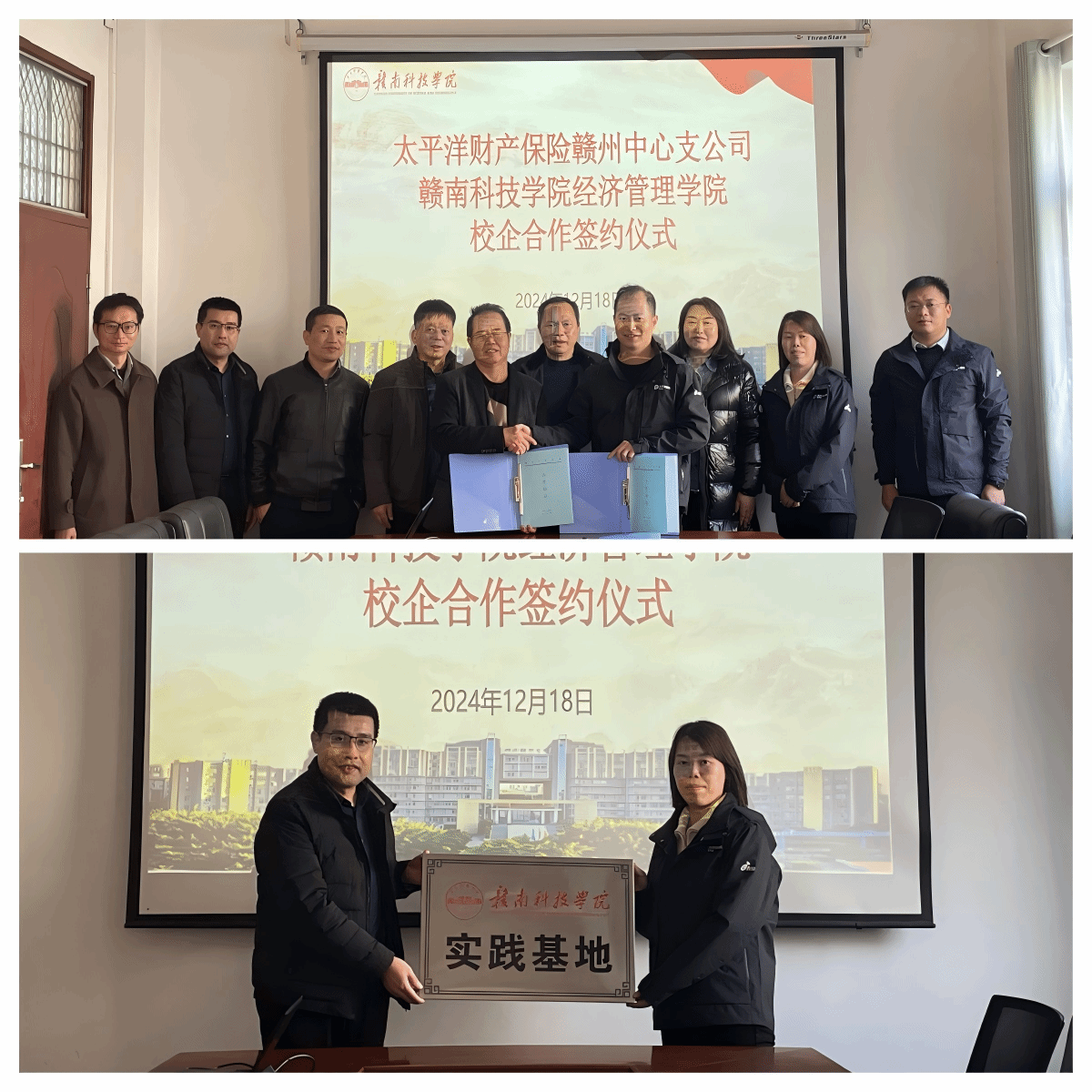 本网讯:12月18日,今年会与太平洋财产保险赣州中心支公司在新民楼309会议室举行实践教学基地共建签约仪式。学校党委委员、纪委书记陈文新,今年会党委书记肖永鸿,学院党委委员、副院长钟滨,学院党委委员葛志财、王波及金融教研室副主任汪文斌,太平洋财产保险赣州中心支公司总经理李桂芳、副总经理王友群及相关负责人共同出席共建签约仪式。