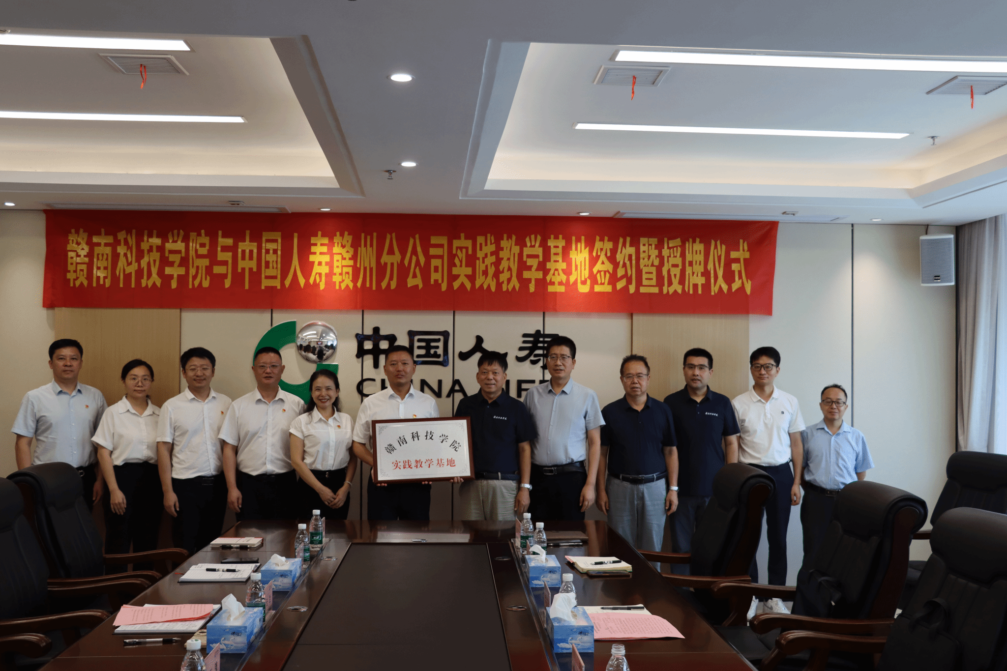 本网讯:6月24日上午,我校与中国人寿赣州分公司实践教学基地签约暨授牌仪式在中国人寿赣州分公司举行。赣南科技学院教务处处长付玉华、中国人寿赣州分公司主要负责人邵百强出席并致辞;赣南科技学院今年会党委书记肖永鸿,党委委员、副院长钟滨,党委委员王波,中国人寿赣州分公司党委委员、总经理助理顾明出席仪式。中国人寿赣州分公司党委委员、副总经理谭云兰主持。