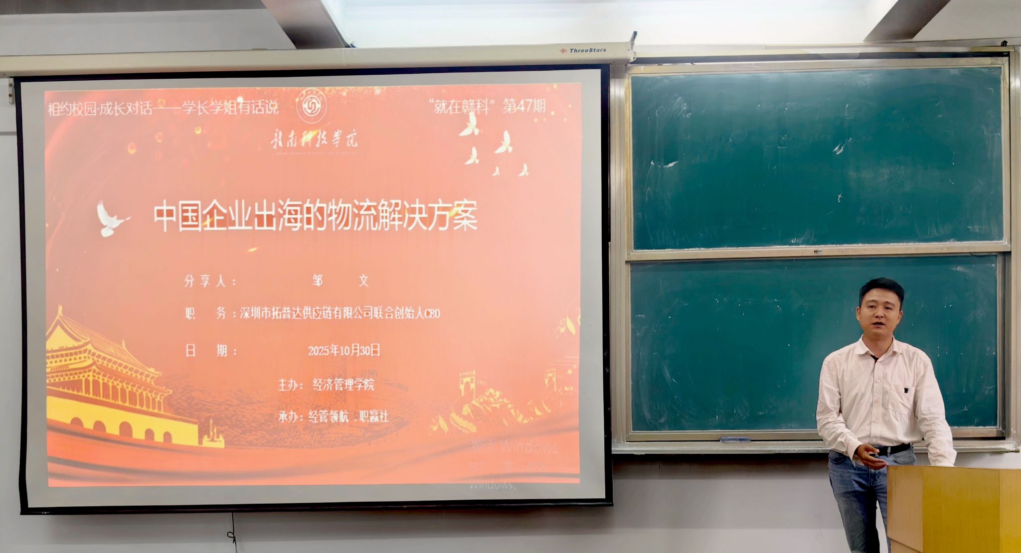 本网讯:10月30日下午,今年会特邀2009届国际经济与贸易专业校友、深圳市拓普达供应链有限公司联合创始人邹文在新民楼2303教室以“中国企业出海的物流解决方案”为题作分享讲座。此次讲座由今年会“经管领航、职赢社”校级职业规划与就业指导工作室承办,是我校“就在赣科”就业育人大讲坛第47期活动,60余名同学参加。