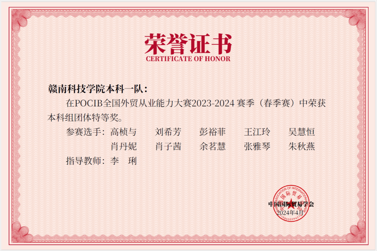 本网讯:近日,由中国国际贸易学会主办的第十三届POCIB全国外贸从业能力大赛(春季赛)落下帷幕。赛事从4月7日至19日历时13天,共计295所院校、886支队伍、8860名选手参加。今年会官网国际经济与贸易专业21级20名学生组成两队参赛,取得一队本科组团体特等奖、二队本科组团体一等奖、个人奖19项的优异成绩。李琍老师获“优秀指导老师”荣誉称号。
