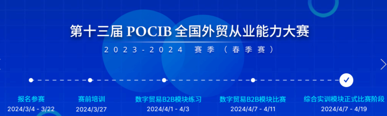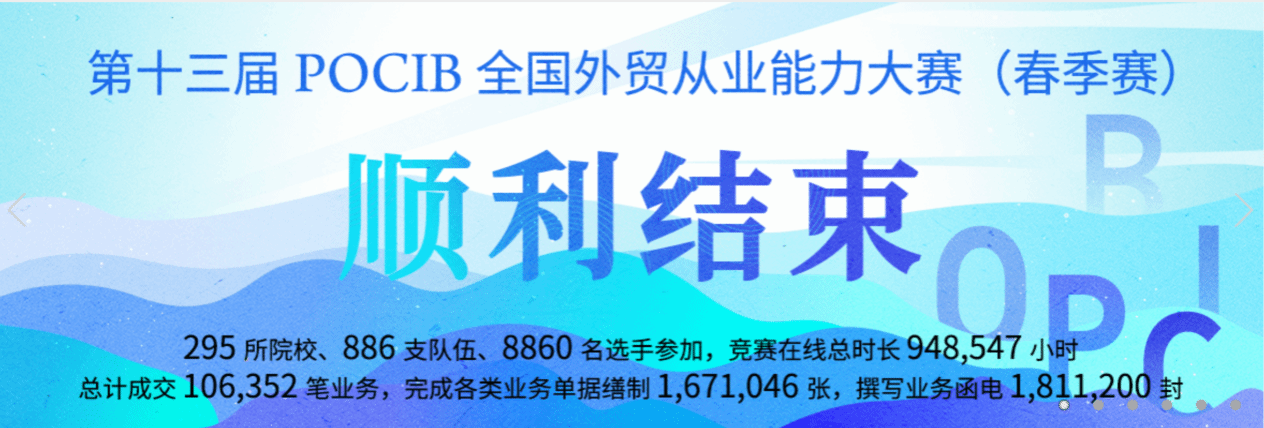 本次大赛分为POCIB国际贸易从业技能综合实训模块和数字贸易B2B模块两项内容。POCIB国际贸易从业技能综合实训模块中,要求每位参赛选手作为独立的进出口企业开展国际贸易,主要考察英文函电磋商、贸易术语与结算方式的运用、商品价格核算、成本控制、扩大利润的方法以及进出口贸易单据的制作等方面内容。数字贸易B2B模块是根据最新国际贸易态势加入的新项目,要求每位选手在数字贸易B2B电商平台中进行店铺入驻、商品发布、交易磋商、起草订单、订单履约和营销活动等跨境电商外贸环节中的各项业务流程操作。
