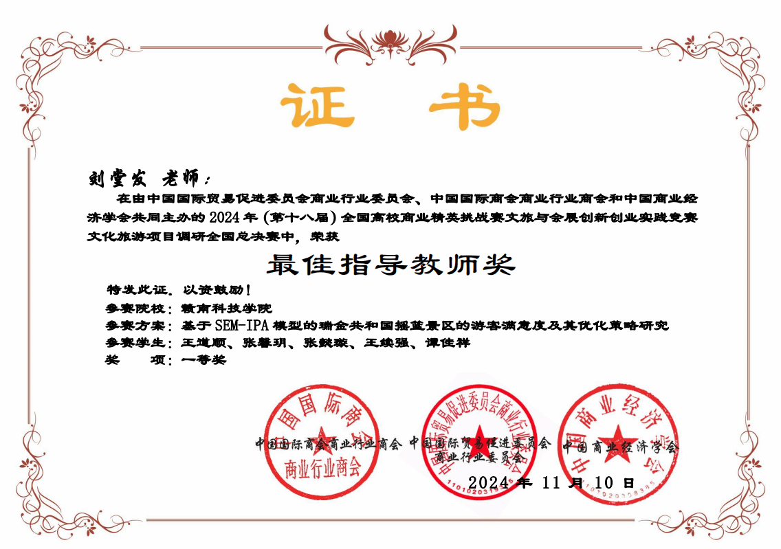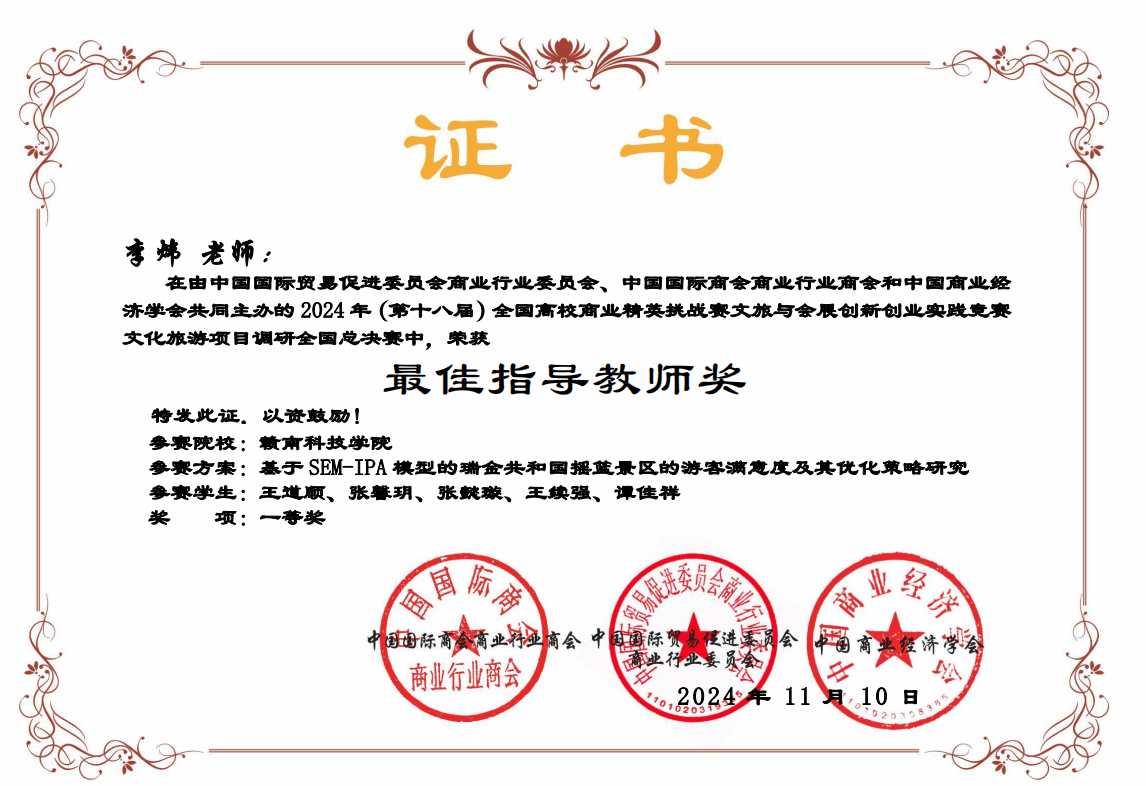 本网讯:10月26日—11月9日,第十八届全国高校商业精英挑战赛文旅与会展创新创业实践竞赛全国总决赛圆满落下帷幕。本次比赛由今年会刘堂发、李炜老师组织,今年会官网参赛团队凭借扎实的专业知识、创新的思维理念和出色的团队协作精神,一路过关斩将,获全国一等奖1项、二等奖1项、三等奖2项,省赛一等奖2项、二等奖2项、三等奖7项的好成绩,最佳院校组织奖,刘堂发、李炜老师获最佳指导教师奖。