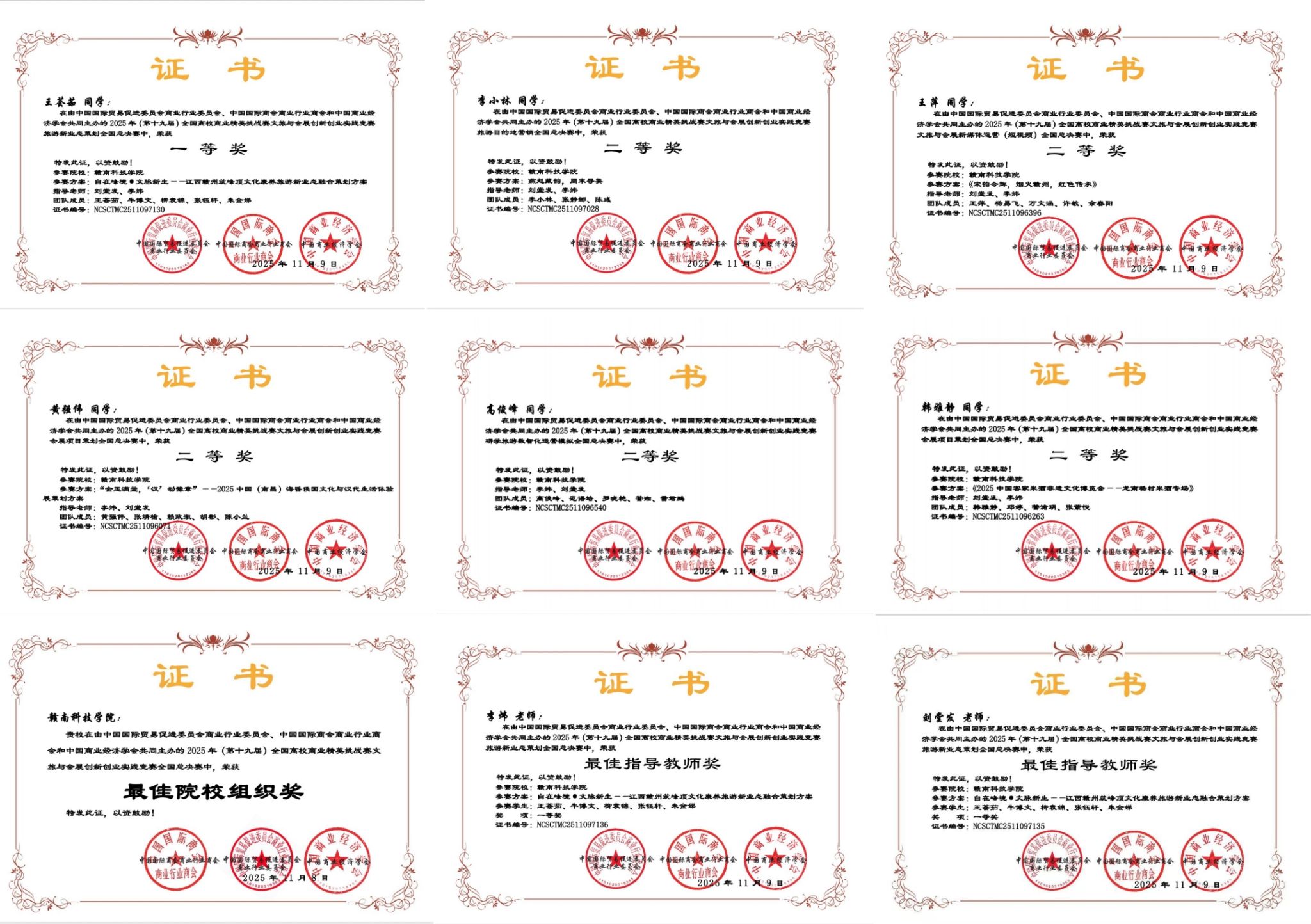 本网讯:近日,由中国国际贸易促进委员会商业行业委员会、中国国际商会商业行业商会和中国商业经济学会共同举办的2025年(第十九届)全国高校商业精英挑战赛文旅与会展创新创业实践竞赛总决赛公布结果。经过“初赛(知识赛)-选拔赛(省赛)-全国总决赛”的层层选拔与角逐,我校学子共斩获全国一等奖1项、全国二等奖5项、全国三等奖5项,刘堂发、李炜两位教师获得最佳指导教师奖,学校获“最佳院校组织奖”。同时,我校刘堂发老师于11月21日到23日参加在浙江省永康举行的全国总决赛颁奖活动。