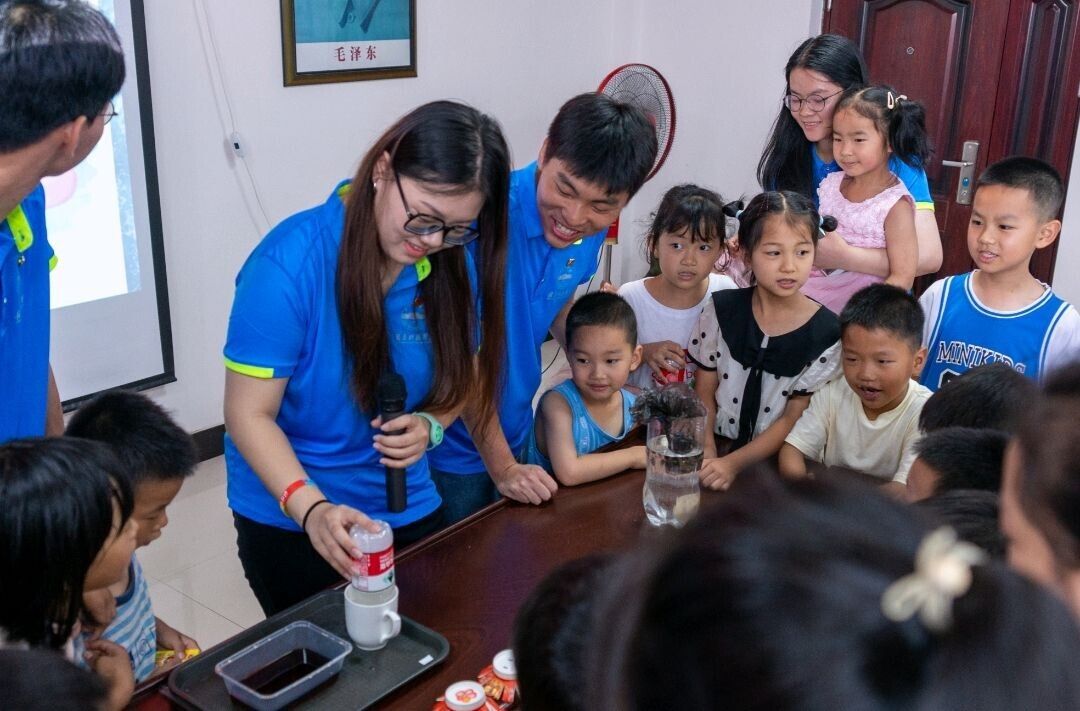 图为蓝鸢队队员们与小朋友们一起做防溺水科学小实验。中国青年网通讯员 王萍 供图