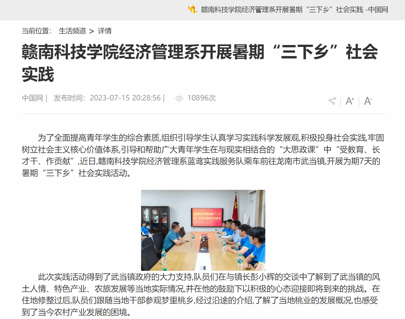 中国网7月15日载:为了全面提高青年学生的综合素质,组织引导学生认真学习实践科学发展观,积极投身社会实践,牢固树立社会主义核心价值体系,引导和帮助广大青年学生在与现实相结合的“大思政课”中“受教育、长才干、作贡献”,近日,赣南科技学院经济管理系蓝鸢实践服务队乘车前往龙南市武当镇,开展为期7天的暑期“三下乡”社会实践活动。