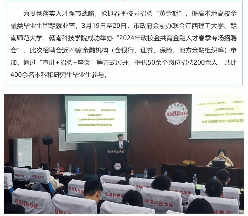 为贯彻落实人才强市战略,抢抓春季校园招聘“黄金期”,提高本地高校金融类毕业生留赣就业率,3月19日至20日,市政府金融办联合江西理工大学、赣南师范大学、赣南科技学院成功举办“2024年政校金共育金融人才春季专场招聘会”,此次招聘会近20家金融机构(含银行、证券、保险、地方金融组织等)参加,通过“宣讲+招聘+座谈”等方式展开,提供50余个岗位招聘200余人,共计400余名本科和研究生毕业生参与。