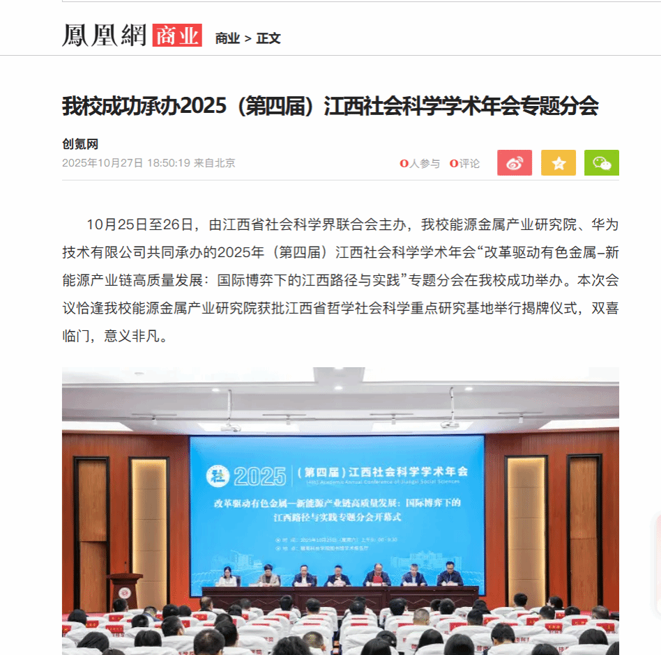 本网讯:10月25日至26日,由江西省社会科学界联合会主办,我校能源金属产业研究院、华为技术有限公司共同承办的2025年(第四届)江西社会科学学术年会“改革驱动有色金属-新能源产业链高质量发展:国际博弈下的江西路径与实践”专题分会在我校成功举办。本次会议恰逢我校能源金属产业研究院获批江西省哲学社会科学重点研究基地举行揭牌仪式,双喜临门,意义非凡。