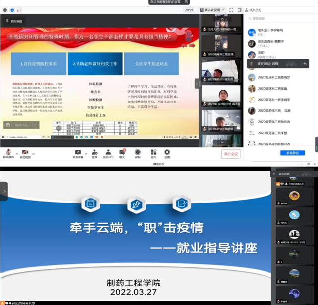 他们是战“疫”宣传员。在青马培训课上,学院学生工作队伍结合举国上下团结一心抗击疫情的生动教材诠释了属于青年的“使命与担当”,引导学生在校园封闭管理的特殊时期争做一名有担当、善作为的学生干部。围绕“保持良好心态”、“与他人有效沟通”等主题对学生进行专题培训,促进学生在和谐人际关系中健康成长。举办“牵手云端,‘职’击疫情”就业指导讲座,为学生顺利就业保驾护航。