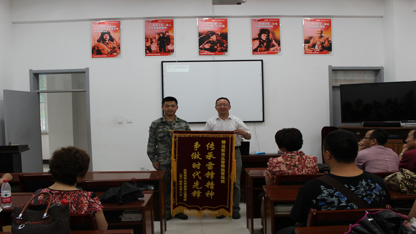 上午10时许,一行人到达了抚顺雷锋班。在雷锋班战士的热心引领下,大家首先来到雷锋纪念馆,认真倾听了战士讲解员的详细讲解,系统全面的了解雷锋同志从一个农村苦孩子成长为革命战士的经历。接下来,大家来到雷锋班的宿舍。在这里,雷锋班战士介绍了在25任班长的带领下,雷锋精神不断传承和发扬,在国内以及国际均产生了巨大的影响。最后,大家观看了雷锋精神宣传片——《与雷锋同在》,感受雷锋精神如春风化雨,深入人心。整个参观过程中,通过一幅幅珍贵的照片,一则则生动感人的故事,一段段精彩的视频,大家深刻的认识到,雷锋精神是一个永远不可泯灭的历史丰碑。临别之际,学院分党委书记张伟代表学院向雷锋班赠送“传承雷锋精神,争做时代先锋”锦旗表示敬意,并接受雷锋班代表赠送的《感悟雷锋精神》系列书籍。